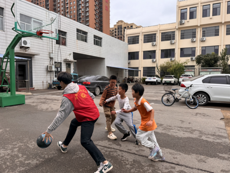 除了学业辅导,篮球互动环节更是将活动推向了高潮。学长发挥带头作用,从基础的拍球、运球技巧教起,到分组进行传球接力、小型对抗赛,志愿者们将专业的体育知识转化为孩子们易懂乐学的运动游戏。图中志愿者与孩子在球场上奔跑追逐、切磋球技的画面,正是这场活力盛宴的生动缩影。