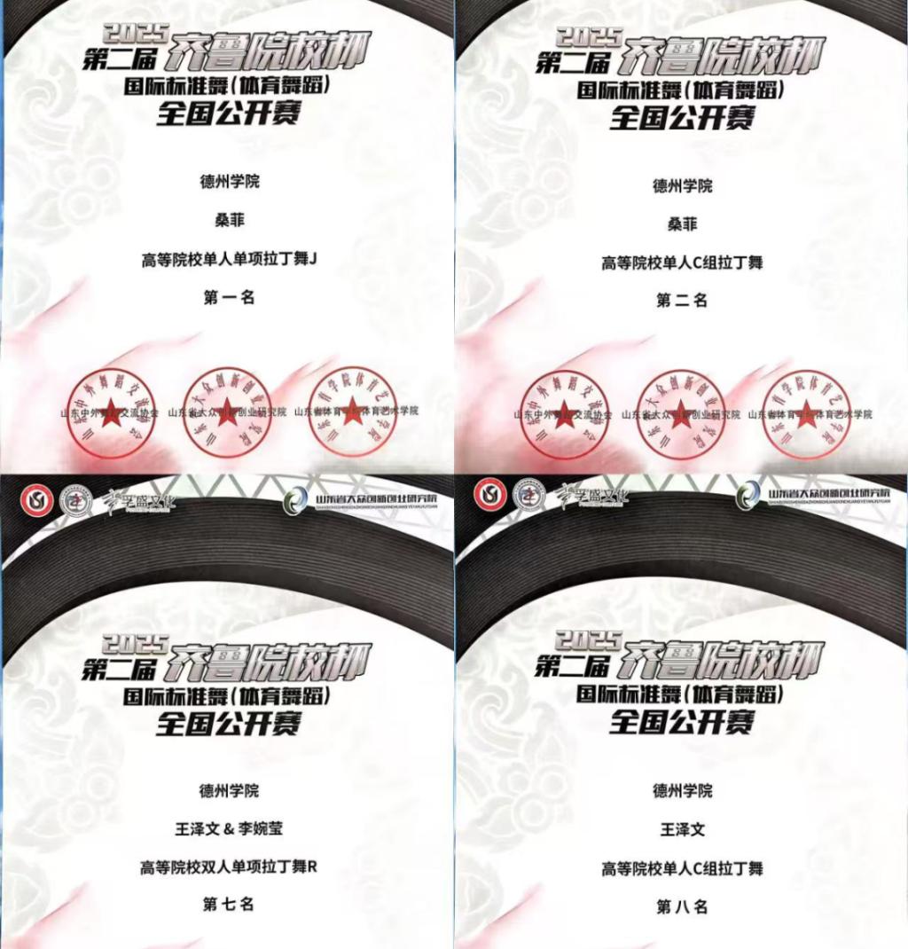 桑菲同学独揽两奖,先后斩获“高等院校单A项拉丁J组”冠军与“高等院校单A组拉丁舞”亚军;王泽文获单人组第八,其与李婉莹组成的双人组亦拿下第七名。