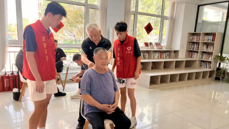 在南城社区,十余个推拿服务点位有序排开。实践团成员由专业老师指导,为老年人进行推拿与按摩,缓解身体疲劳和疼痛,传授了一些肩颈放松、肌肉拉伸的理疗小方法。