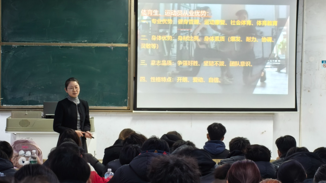 讲座伊始,王蓓蓓结合自身在体育行业的从业经验,解析了当前体育产业的就业新场景——从健身管理、运动康复到社会体育服务,详细介绍了各赛道的岗位需求与能力要求,并展示了GT国际健身学院的实训基地与校企合作就业资源,为学生提供了实操与就业衔接的参考方向。