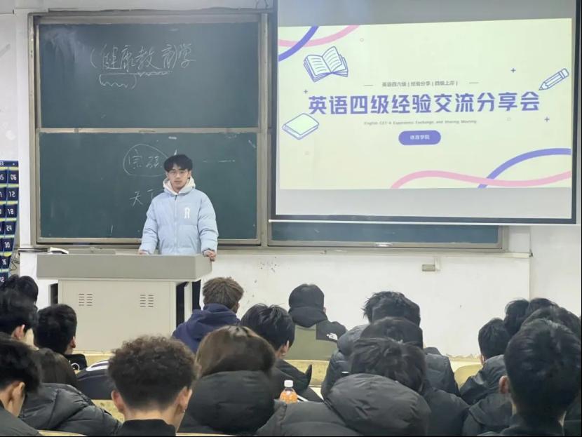 2025年3月5日晚的分享会上,韩咏泽、牛昌翔和宋文豪三位同学结合自身备考经历,从不同角度分享了他们的经验和心得。他们为同学们提供了四级备考经验,帮助同学们有效地掌握了学习方法和技巧,解答了同学们在备考过程中的疑惑,增强了备考信心,促进了同学间的学习交流,营造了良好的学习氛围。