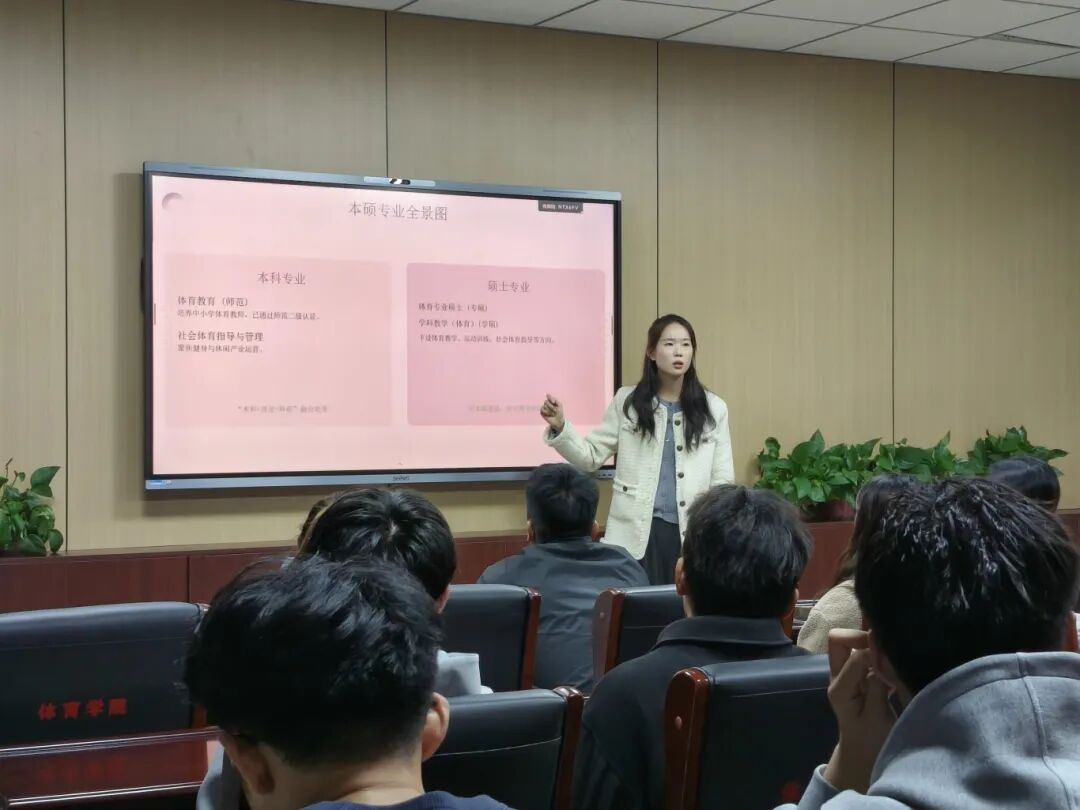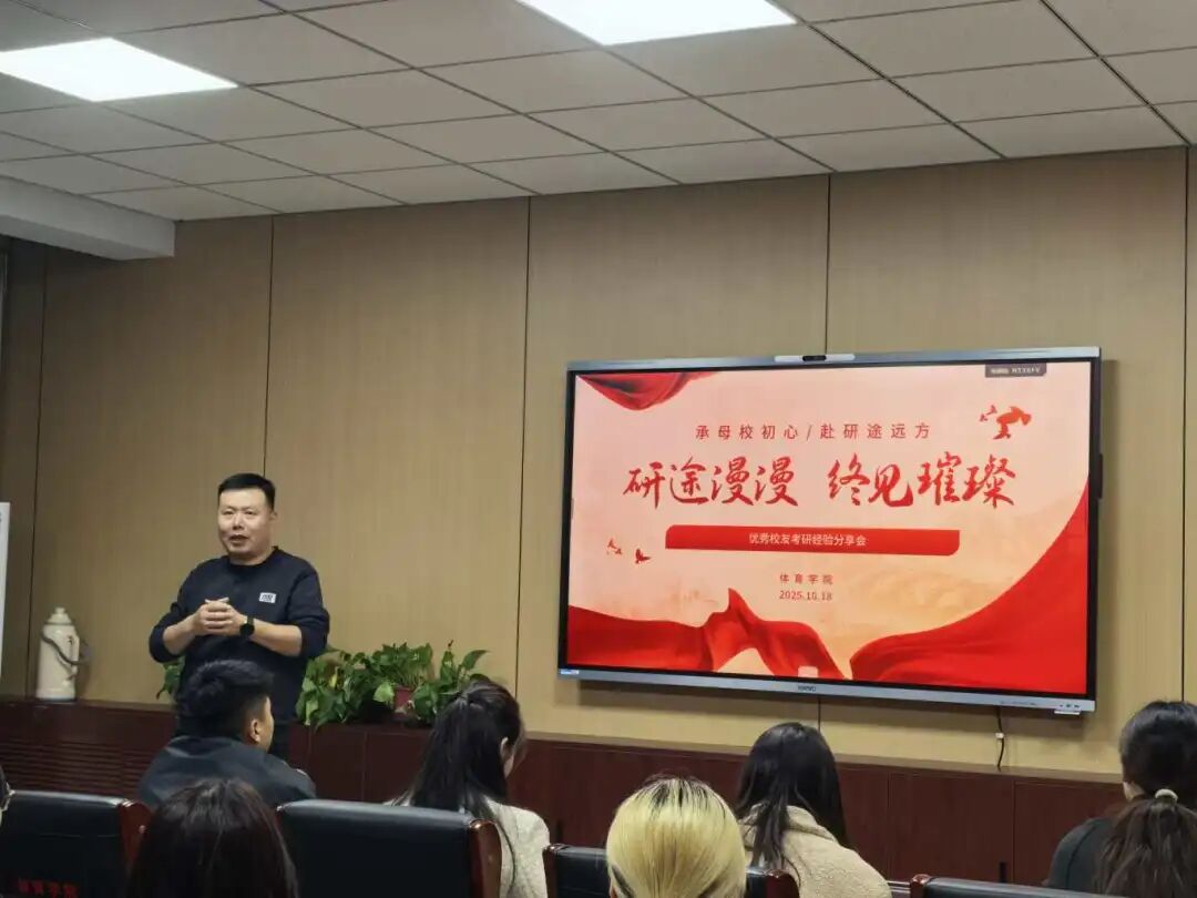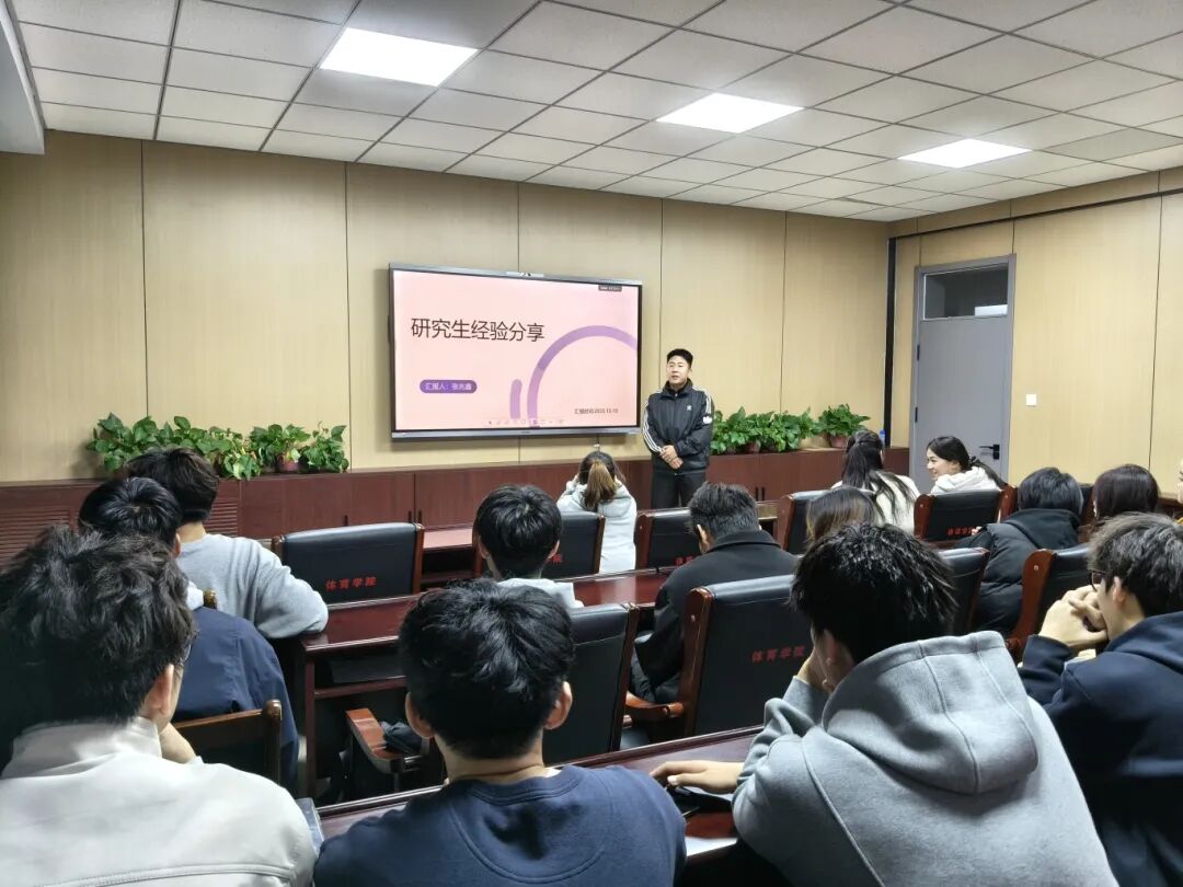 随后,多位成功上岸的优秀学长学姐依次登台,通过PPT展示为学弟学妹们带来满满“干货”。他们结合自身备考经历,围绕“考研目标确定与院校专业选择”“公共课复习规划与技巧”“体育专业课重点梳理与高效记忆”三大核心内容展开分享,详细讲解了备考各阶段的时间分配、资料选择及重难点突破策略;同时针对体育生普遍关心的“训练间隙碎片化复习”“专业课笔记整理”“备考心态调整”等问题给出具体建议,并特别分享了复试准备中的注意事项。互动环节里,同学们积极提问,学长学姐耐心解答,用真诚交流驱散备考迷茫,现场氛围热烈融洽。